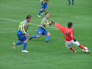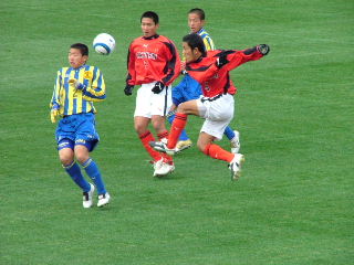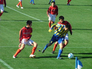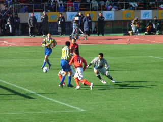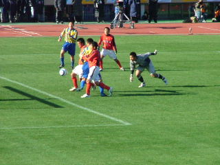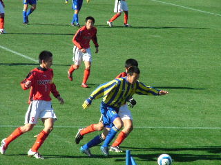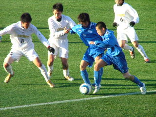 国見・渡邉千真選手を押さえる鹿児島実業・岩下選手他